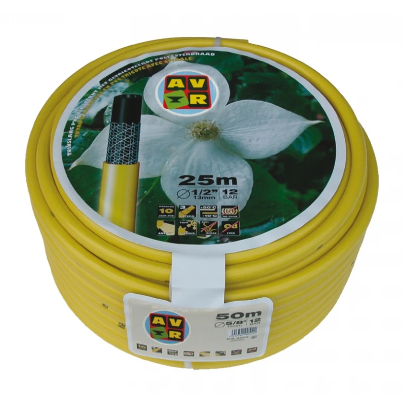 Deze getricoteerde gele tuinslang is geschikt voor het verplaatsen van water op een grote afstand. Hij heeft een doorsnede van 1/2ā inch en een lengte van 50m. Voor het aansluiten van de tuinslang op de kraan is een kraanstuk en een snelkoppeling nodig. Voor het aansluiten van de tuinslang op een sproeier of tuinspuit is een snelkoppeling met stop nodig.