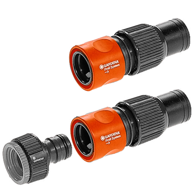 De GARDENA ‘Profi’ Maxi-Flow System Aansluitset verbindt de kraan met een ondergronds GARDENA Sprinklersystem of de GARDENA Pipeline – met behulp van de ‘Profi’ System Aansluitstukken voor een hogere watertoevoer. Inhoud: 1 Kraanaansluitstuk met adapter voor kranen met schroefdraad van 26,5 mm (G 3/4) en schroefdraad van 33,3 mm (G 1), 2 ‘Profi’ Max-Flow System Slangstukken voor tuinslangen van 19 mm (G 3/4″).