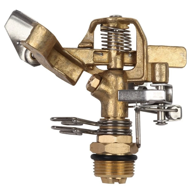 Deze messing sektorsproeiermet een 3/4″ aansluiting is geschikt voor het gelijkmatig besproeien van grote oppervlaktes. Deze sproeier is voorzien van diverse standen. U kunt eenvoudig instellen welke sector besproeid moet worden. De sproeier kan ingesteld worden door de sectorbegrenzers uit elkaar of naar elkaar toe te draaien. Bij het uit elkaar draaien zal de straal smaller worden, en door deze weer naar elkaar toe te draaien maakt u de straal breder. De sectorbegrenzers zijn de twee haken die net boven het schroefdraad zitten. De sectorsproeier kan ook 360 graden sproeien als u de aanslagveer naar boven klapt.