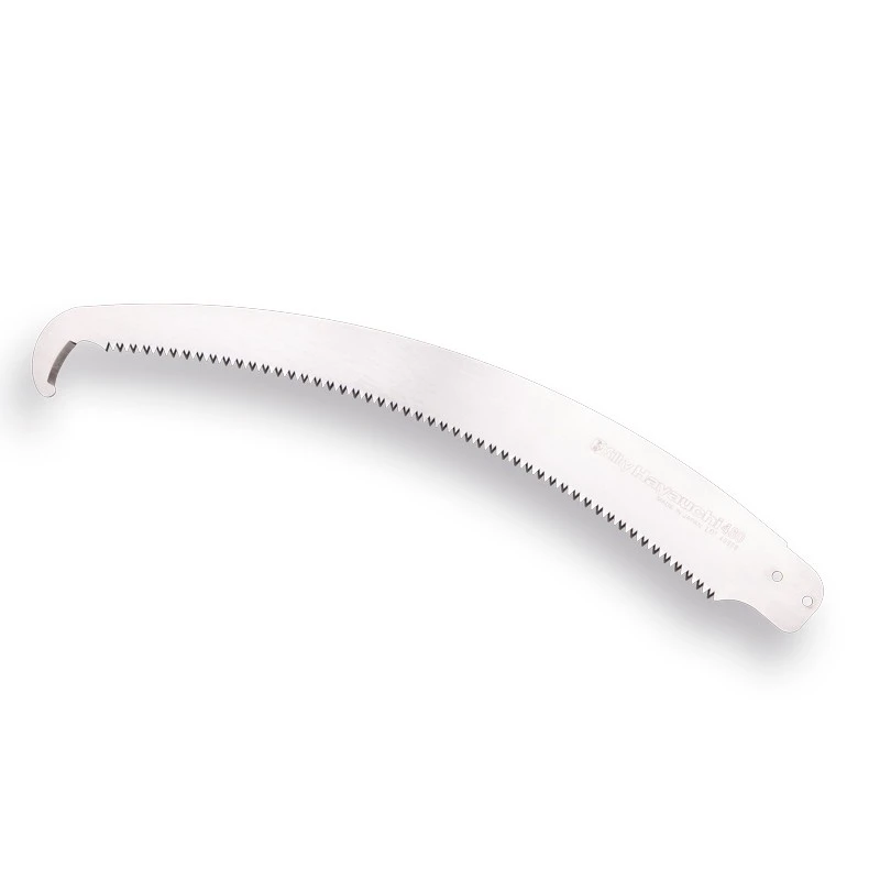 Zaagblad voor Silky stokzaag Hayauchi lengte 480 mm – 6,5 tanden per inch. (SILKY artikelnummer KZSI177399N) Het 480 mm lange gebogen blad van de Hayauchi is voorzien van SilkyÕs unieke 4-RETSUME vertanding. Deze laser uitgesneden tanden, met een kerf van 2,3mm, zorgen voor een grote houtafname zodat u gemakkelijk en razendsnel de dikste takken doorzaagt zonder dat de zaag vast te komt te zitten. Het zaagblad is voorzien van Nikkel coating, is flexibel en alleen de vlijmscherpe tanden zijn impulsgehard. Twee messen (sikkels) zorgen samen voor een optimaal snoeiresultaat. Met het optionele ondermes snijdt u de bast in, zodat deze niet langs de stam afscheurt als de tak valt. Het bovenmes voorkomt dat de zaag uit de zaagsnede raakt. En u kunt, met dit bovenmes, eenvoudig twijgjes van de stam wegsnijden of kleine (dode) takken mee uit de boom trekken. De naam Hayauchi is een samenvoeging van de Japanse benamingen voor ÔsnelÕ (haya) en ÔzagenÕ (uchi). Snoeien op afstand vraagt om een betrouwbare en veelzijdige zaag. Silky zagen worden wereldwijd gebruikt door professionals en door kwaliteit liefhebbers. Geproduceerd in Japan sinds 1919 uit hoogwaardig SK-4 Carbonmetaal.