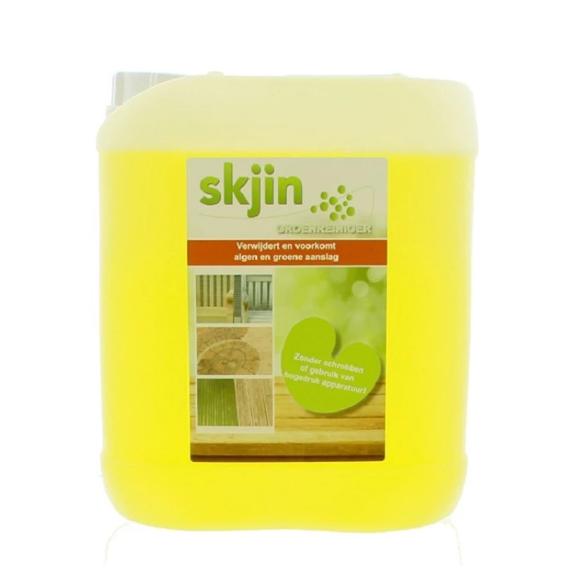 Skjin Groenreiniger is het milieuvriendelijke product dat eenvoudig en effectief algen, mossen en groene aanslag verwijdert. Dit zonder schrobben of gebruik van hogedrukapparatuur. Het is biologisch afbreekbaar, heeft een neutrale pH waarde en is vriendelijk voor mens en materiaal. Niet schadelijk voor de ondergrond.