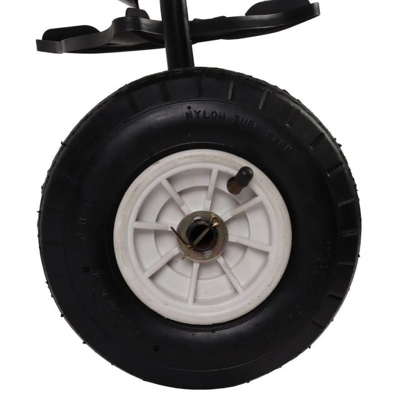 Deze strooiwagen is voorzien van een kunststof bak van 20 liter, ideaal voor het strooien van kalk, mest, graszaad of zout.